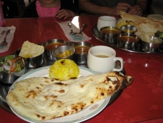 今日は 朝起きると小雨が降っていて、いつもの袖なしワンピースでは寒い位だった。 残念なことに 雨は、すぐ止んで 晴れてきて、涼しさは続かなかったけどネ。 それでも、最高気温は30℃以下で 過ごしやすい1日だった。 主人がゴルフコンペに出かけて留守の間に かねてから行きたかった インド料理専門店で 美映達とランチを食べてきた。 インド人が作る本格的なインドカレーを 1度食べてみたいと思っていた私。 挽肉のカレーと野菜のカレーと ナンと サフランライス、 サラダ、スープ、鶏肉のおかず、玉ねぎのインド風漬物など。。。 ナンがモチモチとして美味しいわ〜〜 カレーには、やっぱりナンだよね。(笑) そして、ナンの大きさには驚かされた。有佳里、光汰朗も喜んで食べていたのでホッ! 希望で好みの辛さにしてくれるらしいけど、普通の辛さで 有佳里でも大丈夫だった。 お店は、会社員風のお客さんで、いっぱいで とても繁盛している様子だ。 食事が終わった頃に、注文しておいた飲み物(アイスコーヒーとコーラ)が。。。 ナント! これで950円(ランチサービス)とは 安くて美味しくて 大満足〜〜♪ お客がいっぱいなのは納得だネと美映と話した。 お店の雰囲気もアジアンチックで 素敵! インド料理の「タージマハル」のHPはここ |