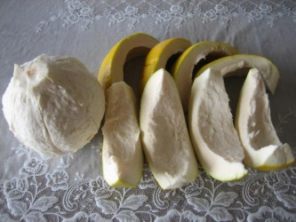2週間前、熊本名産の晩白柚=ばんぺいゆ(世界最大の柑橘類)がジョイフルホンダで 売っていた。あまりの大きさにビックリ〜 スーパーで売っているのは珍しい事なので、記念に買ってきた。(笑) 名前だけは知っていたが、見たのは始めて。。特大のグレープフルーツの様だ。 晩白柚の大きさが分かるようにと、デコポンを隣に置いてみたけど、 まるでミカンみたいに小さく見えるネ。 重さを量ると1.8kg位あった。 普通は2〜3kgの大きさらしいから小さい方の部類みたい。 この大きさは皮の厚さからくるもので、中身はビックリする程小さいよ〜(笑) 味は文旦に似ているけど、ちょっと違う。 あっさりとしていて、ほとんど苦味はない。しっかりとした噛みごたえのある食感。 甘さも弱いし味はイマイチかな〜と思ったが、次の日、また食べたくなる。 なんかくせになる美味しさなのだ。 私好みの味わいだと思った。