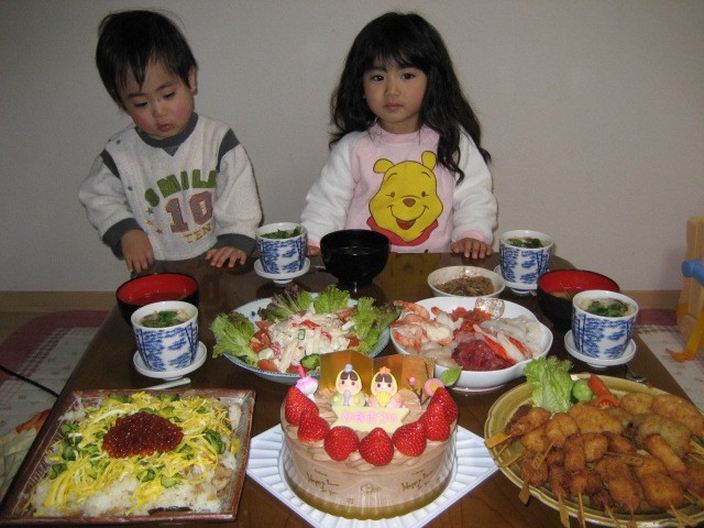 今日は 有佳里にとって4回目の楽しいひな祭り♪ 有佳里の家でひな祭りパーティをするとの事で、楽しみにしていた。 私達が行くと有佳里と光汰朗は、すでにお風呂に入って パジャマ姿でお出迎えだ。 美映手作りのごちそうを食べようとしていた時に、会社から帰ってくるのは 遅くなると思っていた三太パパから「今から帰る」と電話があった。 なんと10分位で到着。宇都宮市内の車通勤なので、東京では考えられない速さ。 玄関のパパに「おじいちゃんとおばあちゃんが来ているよ」とはしゃぎながら、 有佳里は 大きな声で報告していた。 我が家で夕食を美映達とよく食べているけれど、有佳里の家で食べるのは 去年の10月、光汰朗の1歳の誕生日以来だったと気がついた。 有佳里と光汰朗は 我が家では見せた事のない様なはしゃぎ方で大騒ぎ! みんなで乾杯して、散らし寿司、お刺身、サラダ、串揚げ、茶碗蒸しなどの料理を 「美味しい、美味しい」と言いながら、お腹いっぱい食べた。 大勢で食べる料理は 楽しくて美味しいね。(笑) 私達のおみやげのひな祭りケーキを有佳里が食べたいと言うと、パパとママが 「ひな祭り」の歌を有佳里が歌ってから食べようねと。。。 そしたら、恥ずかしがって消え入るような小さな声で歌う有佳里。 歌ってと言われると 得意げに大きな声で歌っていたのに、いつのまにか 恥ずかしがるようになっていた。女の子にと成長してきたんだと感じた。(笑) やっと、大きな声で歌ってくれた「ひな祭り」の歌のビデオは ここ |